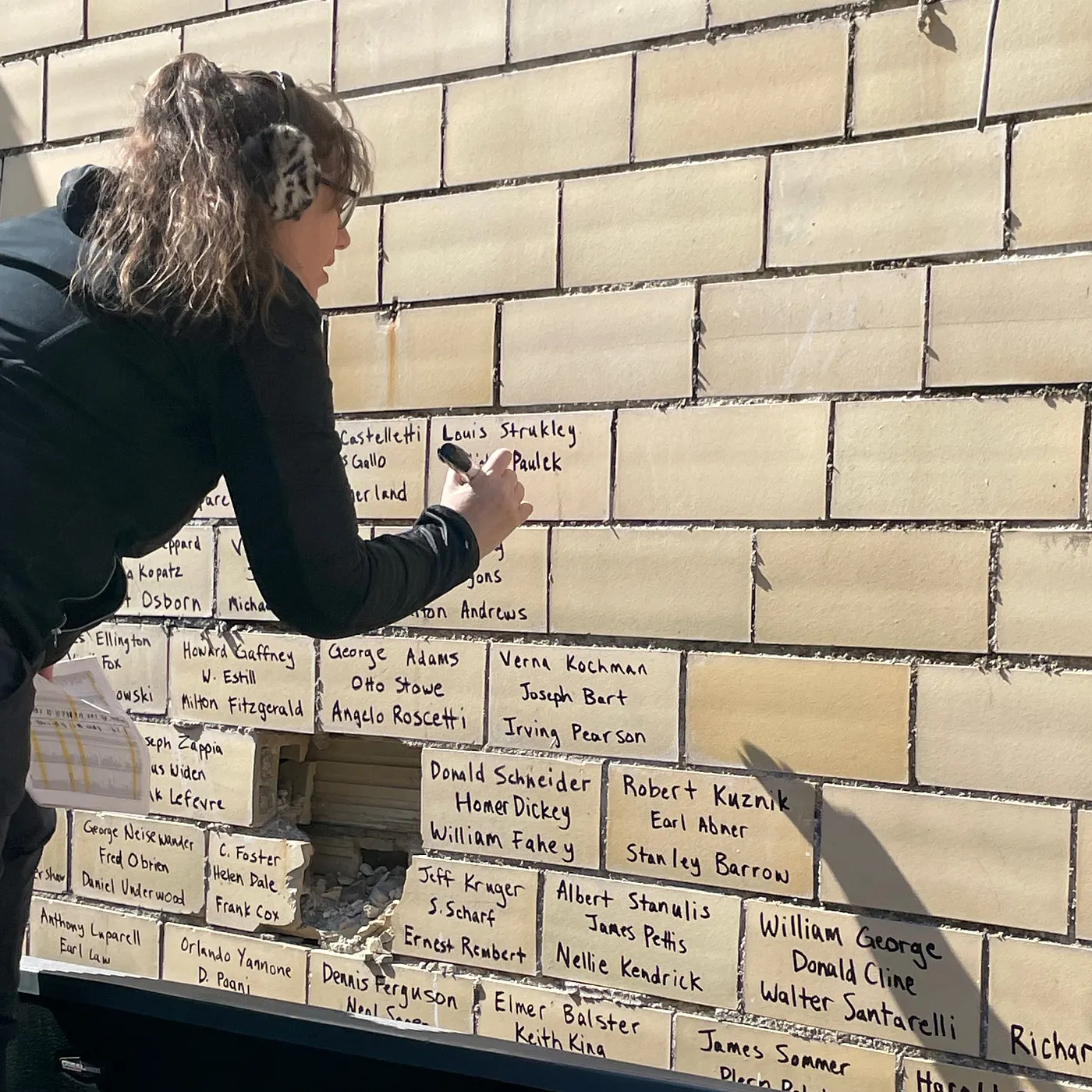 When approaching this project, I had a few things to consider. First, it didn’t need to last forever — just until demolition. Before I began, I did a bunch of tests with paint markers and found that the oil-based ones by Sharpie worked the best. When it came to what order to put the names in, I decided to place them randomly because I suspected there would be additions later. Due to the sheer number of names, there was no way for me to spell check all of them and with the time constraints involved, I also didn’t have time to group people together like a wedding reception seating chart.
